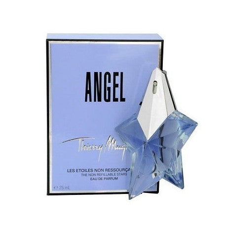 "Angel: un autentico evento olfattivo. Il primo profumo "goloso" con sentori mai sentiti prima di caramello, praline e vaniglia. Le Etoile Angel di Thierry Mugler sono sublimi gemme in vetro celeste, dalle sfaccettature delicatamente scolpite, che creano un suggestivo gioco di luci e ombre.