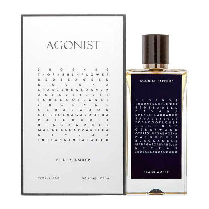 Black Amber di Agonist � una fragranza del gruppo Ambrato Speziato unisex. Le note di testa sono Incenso, Labdano Spagnolo, Alghe e Davana, le note di cuore sono Incenso, Olio di Cypriol o Nagarmotha, Legno di Cedro, Olio di Vetiver di Giava e Fiore di Tabacco, le note di base sono Ambra Grigia, Storace, Patchouli, Vaniglia del Madagascar e Sandalo.