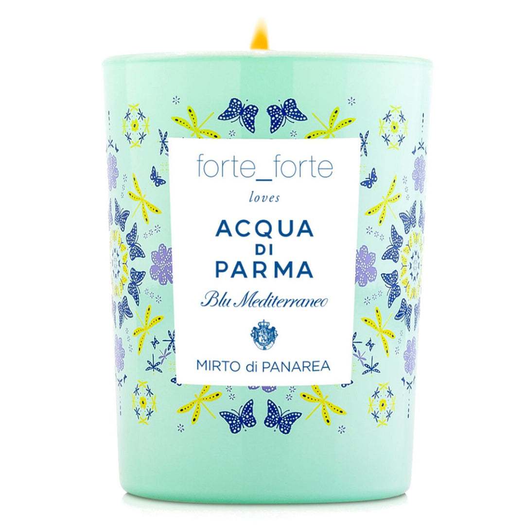 Tutto attorno al vetro farfalle e libellule in volo creano un decoro caleidoscopico e sognante, mentre nell'aria si diffonde lo splendore senza tempo dell'isola di Panarea. Una candela profumata per vivere nei tuoi spazi una profonda sensazione di rinascita. La candela profumata Mirto di Panarea nell'edizione speciale forte_forte loves Acqua di Parma porta negli spazi della tua casa l'emozionante risveglio della natura mediterranea. Da una collaborazione tutta italiana prende vita il magico decoro che avvolge interamente il vetro con i suoi colori puri e vibranti. Una gioiosa atmosfera di rinascita affiora nel caleidoscopio di scintillanti farfalle e libellule, fiori e bacche di mirto. Le note profumate della candela, ispirate ai vividi e armoniosi paesaggi fuori dal tempo dell'isola di Panarea, diffondono in tutta la casa una sensazione di vitale benessere e luminosa libert�