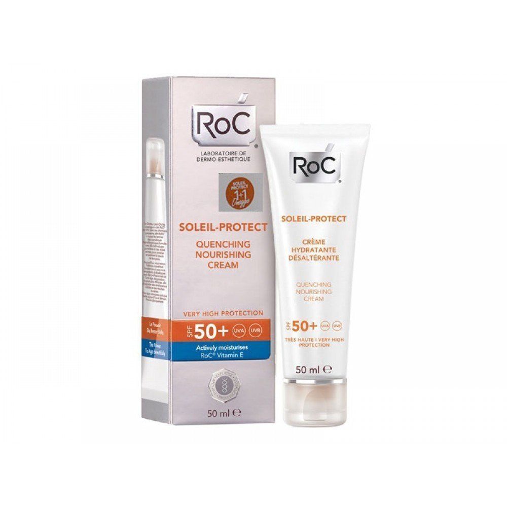 Roc Solari Soleil Protect Nourishing Cream SPF50+ RoC® SOLEIL PROTECT VISO Crema Nutriente SPF50+ Idrata attivamente e protegge l'aspetto giovane della pelle, questa crema protegge dai danni del sole l'aspetto giovane della pelle e la idrata attivamente. Clinicamente testata, svolge una duplice azione per migliorare visibilmente l'aspetto complessivo della pelle: 1. Protegge l'aspetto giovane della pelle: Grazie alle elevate prestazioni dei filtri UVA e UVB, questa crema offre una ottimale protezione solare e previene l'invecchiamento precoce della pelle (rughe, rilassamento, macchie dell'età). Inoltre, essendo arricchita con Vitamina E, un potente antiossidante, contribuisce a proteggere la pelle dagli effetti dannosi derivanti dalle aggressioni ambientali. 2. Idrata attivamente: Arricchita con Burro di Karité, questa crema contribuisce a idratare intensamente la pelle e proteggere il suo aspetto giovane. La sua texture fluida ultra-leggera si assorbe rapidamente senza lasciare residui bianchi.