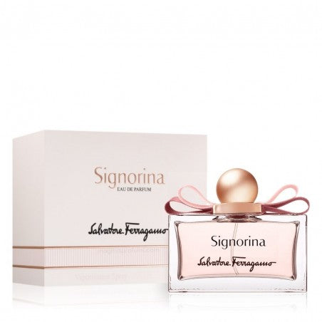 Signorina Eau De Parfum esprime l`essenza di una giovane donna chic con un`allure inconfondibile, sofisticata, fresca e delicatamente audace. Un flacone dalla forma iconica e chic che celebra la giovane donna Salvatore Ferragamo. L`iconico fiocco Vara di Salvatore Ferragamo in gros grain è reinterpretato in due vivaci tonalità di rosa. Le note effervescenti e vivaci del Ribes con un accento speziato di fresco Pepe Rosa donano gioiosità alla fragranza. Nel cuore la freschezza del Gelsomino e l’eleganza della Peonia incontrano la raffinata femminilità della Rosa. Nel fondo la dolcezza della Pannacotta si unisce alle note di Musk e intriganti note boisée di Patchouli.